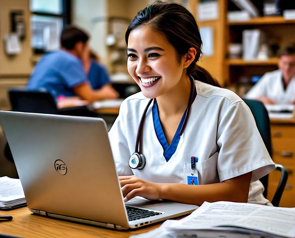 (Insert Image Suggestion: A smiling nursing student in scrubs working on a laptop.)